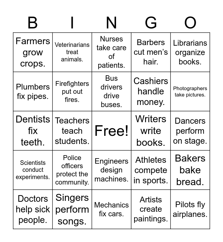 This bingo card has a free space and 29 words: Doctors help sick people., Actors act in movies., Teachers teach students., Chefs cook delicious food, Farmers grow crops., Nurses take care of patients., Firefighters put out fires., Police officers protect the community., Writers write books., Singers perform songs., Dancers perform on stage., Pilots fly airplanes., Mechanics fix cars., Artists create paintings., Photographers take pictures., Carpenters build furniture., Engineers design machines., Scientists conduct experiments., Librarians organize books., Dentists fix teeth., Athletes compete in sports., Hairdressers cut and style hair., Cashiers handle money., Plumbers fix pipes., Barbers cut men’s hair., Veterinarians treat animals., Bakers bake bread., Bus drivers drive buses. and Musicians play instruments..