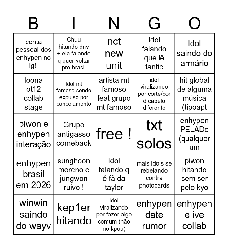 This bingo card has a free space and 24 words: sunghoon moreno e jungwon ruivo !, kep1er hitando, artista mt famoso feat grupo mt famoso, winwin saindo do wayv, Idol saindo do armário, conta pessoal dos enhypen no ig!!, loona ot12 collab stage, Chuu hitando dnv + ela falando q quer voltar pro brasil, txt solos, Idol falando q é fã da taylor, idol viralizando por corte/cor d cabelo diferente, piwon e enhypen interação, mais idols se rebelando contra photocards, piwon hitando sem ser pelo kyo, Idol mt famoso sendo expulso por cancelamento, enhypen date rumor, enhypen PELADo (qualquer um, nct new unit, hit global de alguma música (tipoapt, Grupo antigasso comeback, enhypen e ive collab, enhypen brasil em 2026, Idol falando que lê fanfic and idol viralizando por fazer algo comum (não no kpop).