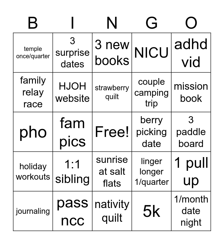 This bingo card has a free space and 24 words: 1:1 sibling, pass ncc, strawberry quilt, journaling, adhd vid, temple once/quarter, family relay race, 3 surprise dates, berry picking date, sunrise at salt flats, couple camping trip, pho, linger longer 1/quarter, 1 pull up, HJOH website, 5k, 3 paddle board, 3 new books, mission book, fam pics, 1/month date night, holiday workouts, NICU and nativity quilt.