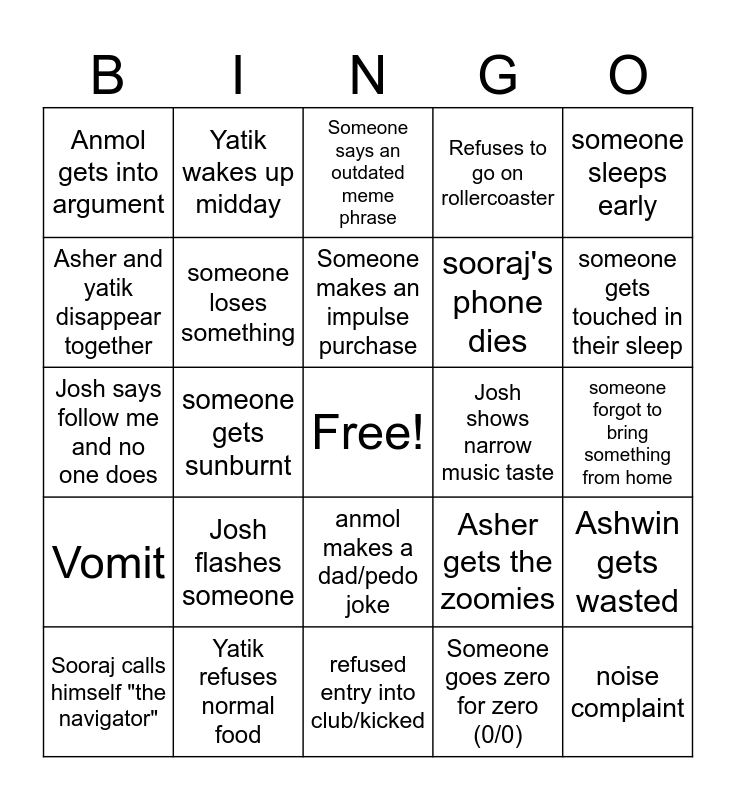 This bingo card has a free space and 24 words: Josh flashes someone, Yatik refuses normal food, Someone makes an impulse purchase, Sooraj calls himself "the navigator", someone sleeps early, Anmol gets into argument, Asher and yatik disappear together, Yatik wakes up midday, Josh shows narrow music taste, anmol makes a dad/pedo joke, sooraj's phone dies, Josh says follow me and no one does, Asher gets the zoomies, Ashwin gets wasted, someone loses something, Someone goes zero for zero (0/0), someone forgot to bring something from home, Someone says an outdated meme phrase, someone gets touched in their sleep, someone gets sunburnt, noise complaint, Vomit, Refuses to go on rollercoaster and refused entry into club/kicked.