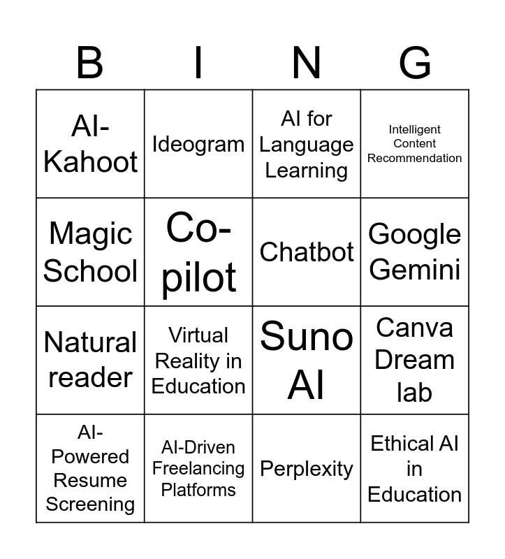 This bingo card has 26 words: POE, AI In seesaw, Google Gemini, curipod, Magic School, AI-Kahoot, Co-pilot, Ideogram, Perplexity, Flint AI, Natural reader, Suno AI, Brisk teaching, Mizou, Canva Dream lab, AI in Special Education, Intelligent Content Recommendation, Ethical AI in Education, AI for Language Learning, AI-Powered Resume Screening, Virtual Reality in Education, Machine Learning, AI-Driven Freelancing Platforms, Virtual AI-Based Market Research Jobs, Chatbot and Resume Building.