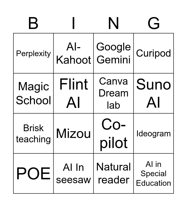 This bingo card has 16 words: POE, AI In seesaw, Google Gemini, Curipod, Magic School, AI-Kahoot, Co-pilot, Ideogram, Perplexity, Flint AI, Natural reader, Suno AI, Brisk teaching, Mizou, Canva Dream lab and AI in Special Education.