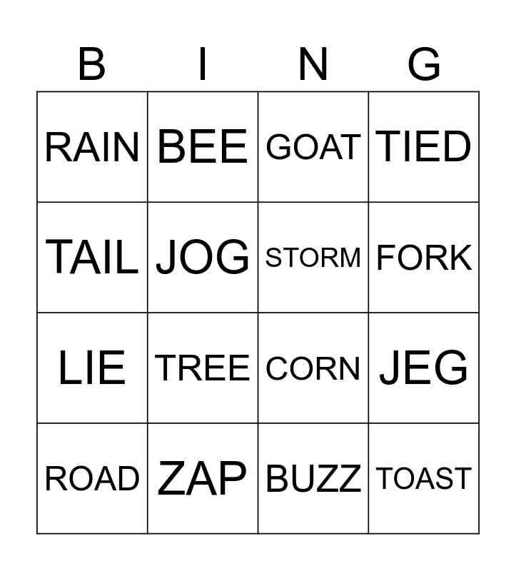 This bingo card has 16 words: ZAP, JEG, GOAT, RAIN, LIE, BEE, CORN, BUZZ, TAIL, JOG, ROAD, TIED, TREE, FORK, STORM and TOAST.