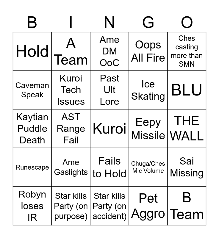 This bingo card has a free space and 24 words: Ame Gaslights, Star kills Party (on purpose), Past Ult Lore, Robyn loses IR, Ches casting more than SMN, Hold, Caveman Speak, A Team, Eepy Missile, Fails to Hold, Ice Skating, Kaytian Puddle Death, Chuga/Ches Mic Volume, Sai Missing, Kuroi Tech Issues, Pet Aggro, THE WALL, Ame DM OoC, BLU, AST Range Fail, B Team, Runescape, Oops All Fire and Star kills Party (on accident).