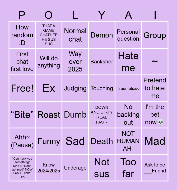 This bingo card has 36 words: Death, Sad, Not sus, First chat first love, “Bite”, Touching, Will do anything, Underage, Personal question, NOT HUMAN AH-, ~, Demon, Mad, Ex, Backshor, How random :D, Ahh~ (Pause), Traumatized, Free!, Normal chat, Judging, Roast, DOWN AND DIRTY REAL FAST-, Dumb, No backing out, THAT A GAME CHATHER HE SUS SUS, Hate me, Know 2024/2025, Way over 2025, Group, Ask to be ___Friend, “Can I ask you something” Me:Ok “Don’t get mad” NOW I AM HURRY UP-, I'm the pet now💀, Pretend to hate me, Funny and Too far.
