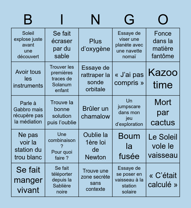 This bingo card has a free space and 24 words: Une combinaison ? Pour quoi faire ?, Se fait téléporter depuis la Sablière noire, Essaye de rattraper la sonde orbitale, Se fait manger vivant, Fonce dans la matière fantôme, Soleil explose juste avant une découvert, Avoir tous les instruments, Se fait écraser par du sable, Un jumpscare dans mon jeu d’exploration, Oublie la 1ère loi de Newton, « J’ai pas compris », Parle à Gabbro mais récupère pas la médiation, Boum la fusée, Le Soleil vole le vaisseau, Trouver les premières traces de Solanum enfant, Essaye de se poser en vaisseau à la station solaire, Mort par cactus, Plus d’oxygène, Kazoo time, Trouve la bonne solution puis l’oublie, « C’était calculé », Ne pas voir la station du trou blanc, Essaye de viser une planète avec une navette nomaï and Trouve une zone secrète sans contexte.