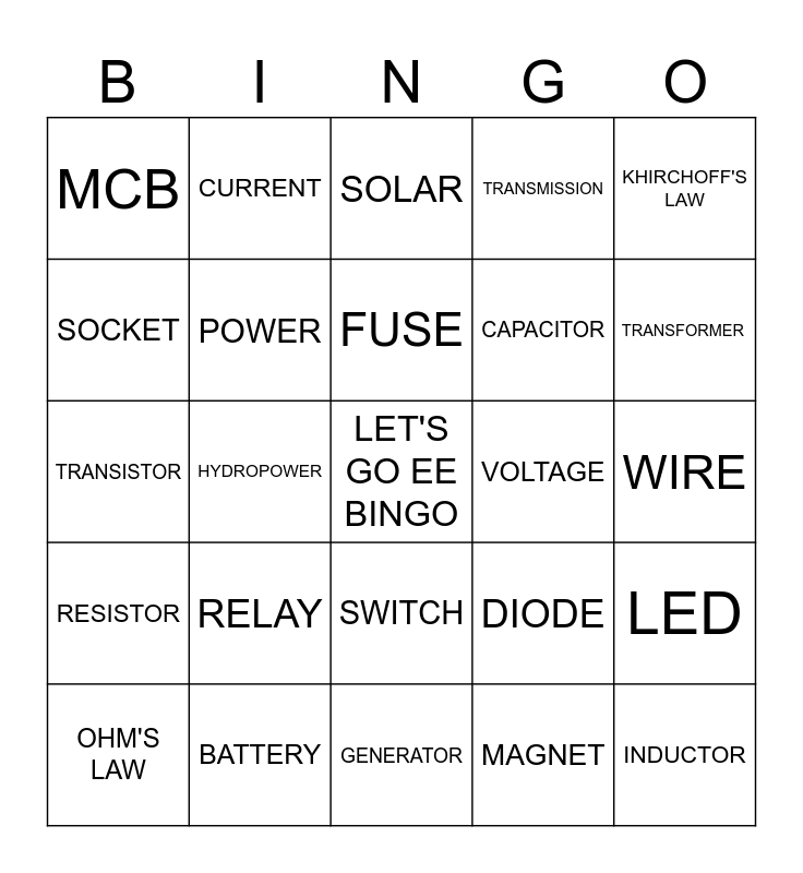 This bingo card has a free space and 24 words: RELAY, BATTERY, FUSE, OHM'S LAW, KHIRCHOFF'S LAW, MCB, SOCKET, CURRENT, VOLTAGE, SWITCH, CAPACITOR, TRANSISTOR, DIODE, LED, POWER, MAGNET, WIRE, SOLAR, TRANSFORMER, HYDROPOWER, INDUCTOR, RESISTOR, TRANSMISSION and GENERATOR.