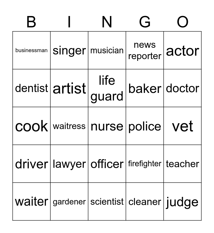 This bingo card has a free space and 24 words: lawyer, gardener, life guard, waiter, actor, businessman, dentist, singer, police, officer, baker, cook, firefighter, teacher, artist, cleaner, vet, musician, doctor, waitress, judge, driver, news reporter and scientist.