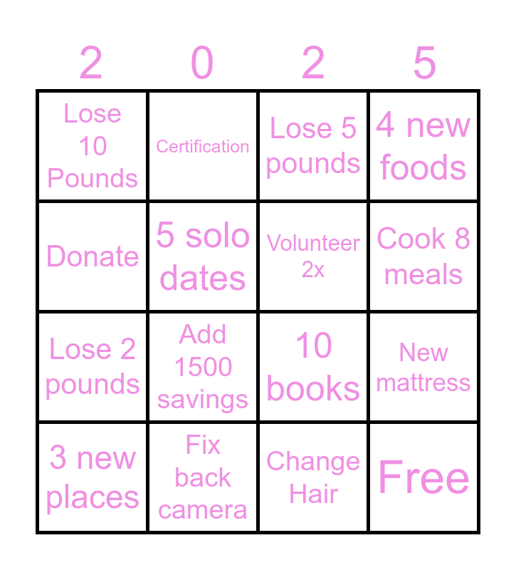This bingo card has 16 words: Fix back camera, New mattress, Lose 5 pounds, Lose 10 Pounds, Lose 2 pounds, Certification, 10 books, Change Hair, Donate, 5 solo dates, 3 new places, 4 new foods, Add 1500 savings, Cook 8 meals, Volunteer 2x and Free.