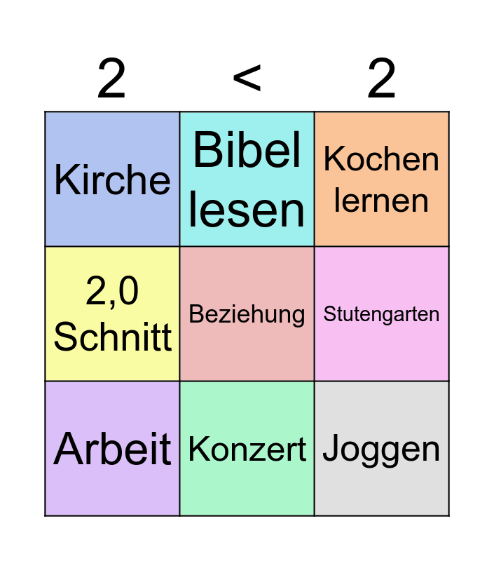 This bingo card has 9 words: Arbeit, Kochen lernen, Bibel lesen, 2,0 Schnitt, Kirche, Stutengarten, Beziehung, Joggen and Konzert.