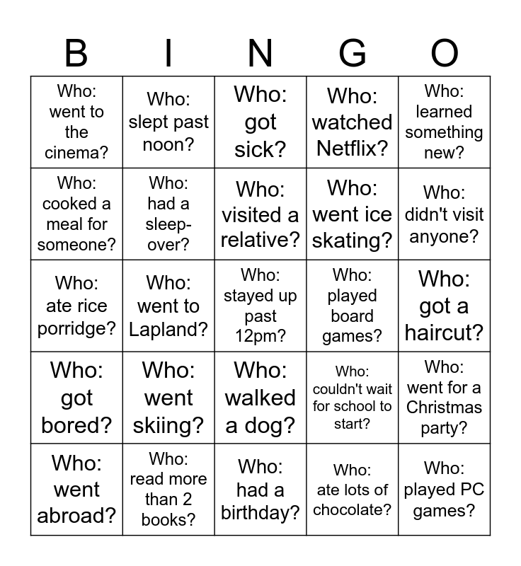 This bingo card has a free space and 24 words: Who: went skiing?, Who: read more than 2 books?, Who: visited a relative?, Who: went abroad?, Who: learned something new?, Who: went to the cinema?, Who: cooked a meal for someone?, Who: slept past noon?, Who: played board games?, Who: walked a dog?, Who: went ice skating?, Who: ate rice porridge?, Who: couldn't wait for school to start?, Who: went for a Christmas party?, Who: had a sleep-over?, Who: ate lots of chocolate?, Who: got a haircut?, Who: got sick?, Who: didn't visit anyone?, Who: went to Lapland?, Who: played PC games?, Who: got bored?, Who: watched Netflix? and Who: had a birthday?.