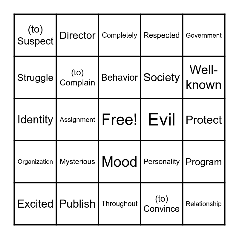 This bingo card has a free space and 32 words: (to) Convince, Often, Assignment, Administration, Organization, (to) Complain, Government, Program, Director, Ordinary, Behavior, Completely, Condition, Disappear, Evil, Exactly, Excited, Identity, Mood, Mysterious, Personality, Prevent, Protect, Publish, Relationship, Respected, Society, Struggle, (to) Suspect, Throughout, Violent and Well-known.