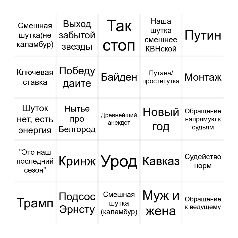 This bingo card has 25 words: Кринж, Смешная шутка (каламбур), Байден, Трамп, Путин, Смешная шутка(не каламбур), Ключевая ставка, Выход забытой звезды, Новый год, Урод, Путана/проститутка, Шуток нет, есть энергия, Кавказ, Судейство норм, Победу даите, Обращение к ведущему, Обращение напрямую к судьям, Так стоп, Монтаж, Нытье про Белгород, Древнейший анекдот, Подсос Эрнсту, "Это наш последний сезон", Наша шутка смешнее КВНской and Муж и жена.