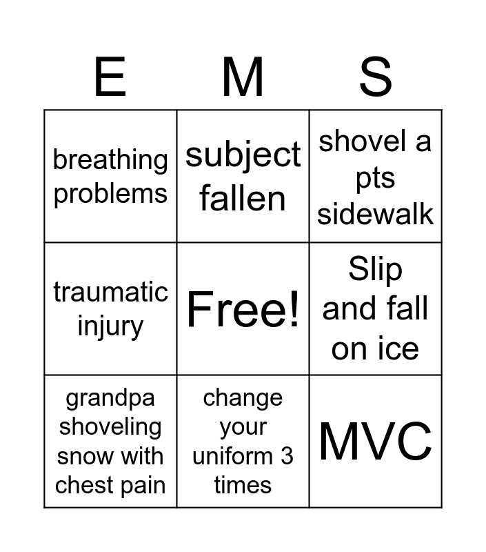 This bingo card has a free space and 8 words: Slip and fall on ice, shovel a pts sidewalk, subject fallen, grandpa shoveling snow with chest pain, breathing problems, MVC, traumatic injury and change your uniform 3 times.