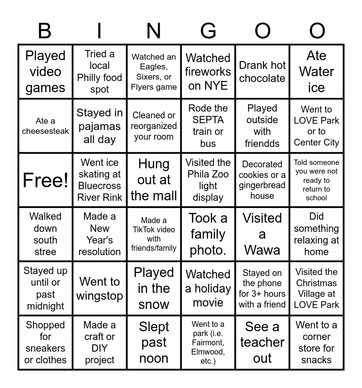 This bingo card has 36 words: Watched a holiday movie, Played in the snow, Went to a park (i.e. Fairmont, Elmwood, etc.), Ate a cheesesteak, Walked down south stree, Visited the Phila Zoo light display, Stayed in pajamas all day, Slept past noon, Drank hot chocolate, Stayed on the phone for 3+ hours with a friend, Went to LOVE Park or to Center City, Watched fireworks on NYE, Visited the Christmas Village at LOVE Park, Went ice skating at Bluecross River Rink, Rode the SEPTA train or bus, Played video games, Stayed up until or past midnight, Decorated cookies or a gingerbread house, Free!, Watched an Eagles, Sixers, or Flyers game, Hung out at the mall, Made a New Year's resolution, Took a family photo., Made a TikTok video with friends/family, Visited a Wawa, Tried a local Philly food spot, Played outside with friendds, Made a craft or DIY project, Cleaned or reorganized your room, Ate Water ice, Went to a corner store for snacks, Shopped for sneakers or clothes, Did something relaxing at home, Told someone you were not ready to return to school, Went to wingstop and See a teacher out.