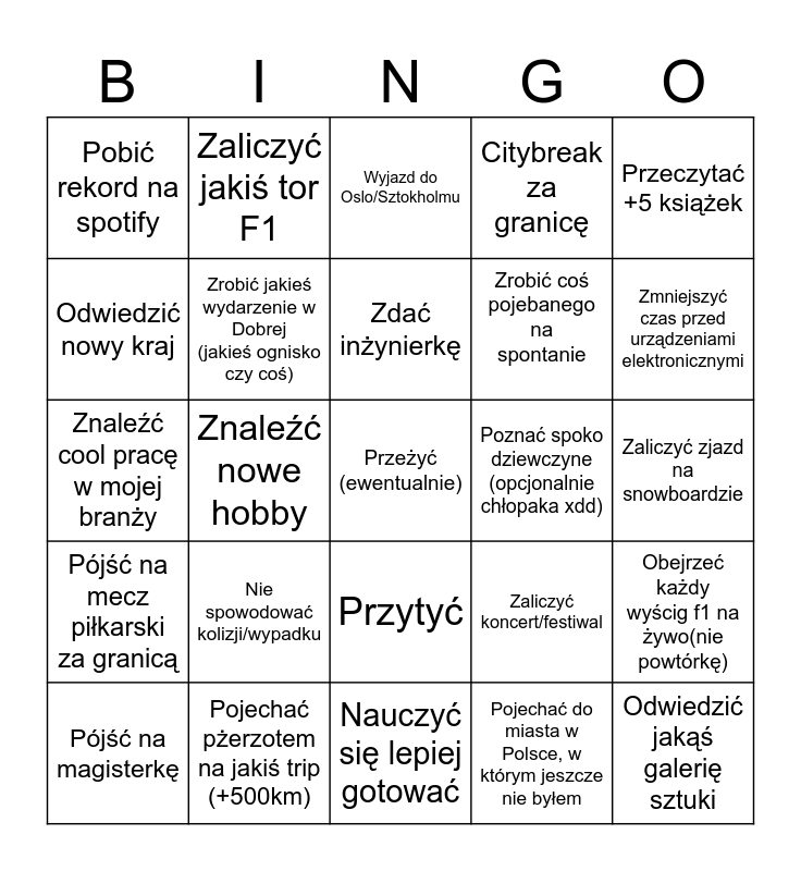 This bingo card has a free space and 24 words: Nie spowodować kolizji/wypadku, Pojechać pżerzotem na jakiś trip (+500km), Zdać inżynierkę, Pójść na magisterkę, Przeczytać +5 książek, Pobić rekord na spotify, Odwiedzić nowy kraj, Zaliczyć jakiś tor F1, Poznać spoko dziewczyne (opcjonalnie chłopaka xdd), Przytyć, Zrobić coś pojebanego na spontanie, Znaleźć cool pracę w mojej branży, Zaliczyć koncert/festiwal, Obejrzeć każdy wyścig f1 na żywo(nie powtórkę), Zrobić jakieś wydarzenie w Dobrej (jakieś ognisko czy coś), Pojechać do miasta w Polsce, w którym jeszcze nie byłem, Zaliczyć zjazd na snowboardzie, Wyjazd do Oslo/Sztokholmu, Zmniejszyć czas przed urządzeniami elektronicznymi, Znaleźć nowe hobby, Odwiedzić jakąś galerię sztuki, Pójść na mecz piłkarski za granicą, Citybreak za granicę and Nauczyć się lepiej gotować.