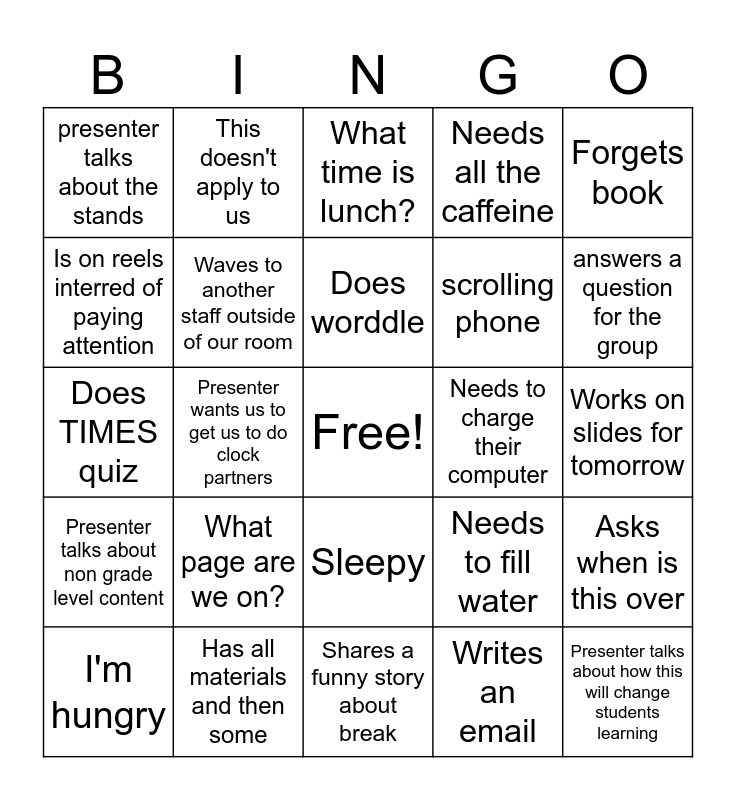 This bingo card has a free space and 24 words: I'm hungry, What page are we on?, Does worddle, Writes an email, Forgets book, presenter talks about the stands, This doesn't apply to us, What time is lunch?, Needs to charge their computer, Works on slides for tomorrow, Does TIMES quiz, Waves to another staff outside of our room, Needs to fill water, Asks when is this over, Is on reels interred of paying attention, Has all materials and then some, Shares a funny story about break, Needs all the caffeine, answers a question for the group, Presenter talks about non grade level content, Presenter wants us to get us to do clock partners, Sleepy, scrolling phone and Presenter talks about how this will change students learning.