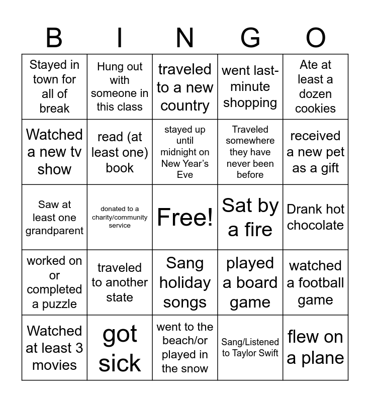 This bingo card has a free space and 24 words: traveled to another state, got sick, stayed up until midnight on New Year’s Eve, Watched at least 3 movies, Ate at least a dozen cookies, Stayed in town for all of break, Watched a new tv show, Hung out with someone in this class, Sat by a fire, Sang holiday songs, Traveled somewhere they have never been before, Saw at least one grandparent, played a board game, watched a football game, read (at least one) book, Sang/Listened to Taylor Swift, Drank hot chocolate, traveled to a new country, received a new pet as a gift, donated to a charity/community service, flew on a plane, worked on or completed a puzzle, went last-minute shopping and went to the beach/or played in the snow.