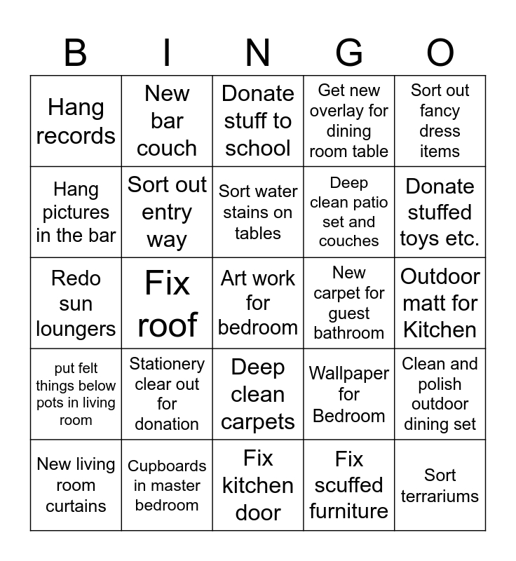 This bingo card has 25 words: Stationery clear out for donation, Fix kitchen door, Sort water stains on tables, New living room curtains, Sort out fancy dress items, Hang records, Hang pictures in the bar, New bar couch, New carpet for guest bathroom, Deep clean carpets, Deep clean patio set and couches, Redo sun loungers, Wallpaper for Bedroom, Clean and polish outdoor dining set, Sort out entry way, Sort terrariums, Outdoor matt for Kitchen, Donate stuff to school, Donate stuffed toys etc., Fix roof, Art work for bedroom, Cupboards in master bedroom, put felt things below pots in living room, Get new overlay for dining room table and Fix scuffed furniture.