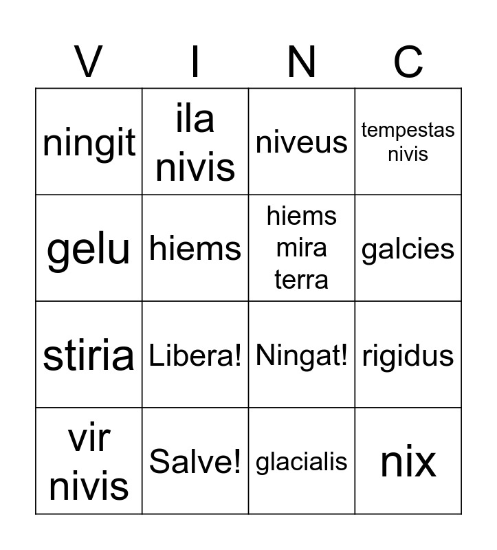 Latin Snow Vocabulary Vinco | Caesar et Pirates | Latin Winter Words 4x4 | Latin Bingo! | Nazareth Latin Words