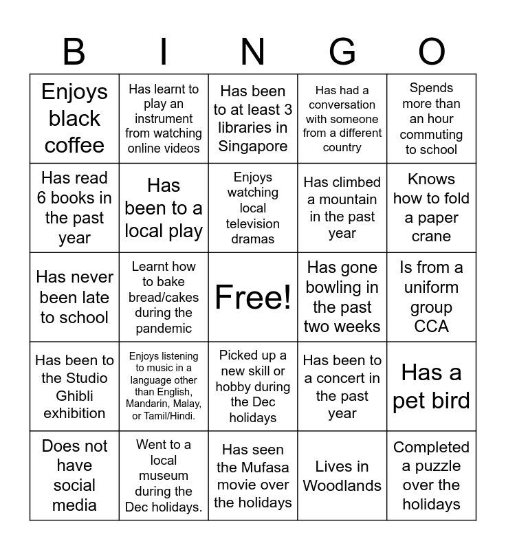 This bingo card has a free space and 24 words: Enjoys listening to music in a language other than English, Mandarin, Malay, or Tamil/Hindi., Went to a local museum during the Dec holidays., Enjoys watching local television dramas, Does not have social media, Spends more than an hour commuting to school, Enjoys black coffee, Has read 6 books in the past year, Has learnt to play an instrument from watching online videos, Has gone bowling in the past two weeks, Picked up a new skill or hobby during the Dec holidays, Has climbed a mountain in the past year, Has never been late to school, Has been to a concert in the past year, Has a pet bird, Has been to a local play, Lives in Woodlands, Is from a uniform group CCA, Has been to at least 3 libraries in Singapore, Knows how to fold a paper crane, Learnt how to bake bread/cakes during the pandemic, Completed a puzzle over the holidays, Has been to the Studio Ghibli exhibition, Has had a conversation with someone from a different country and Has seen the Mufasa movie over the holidays.