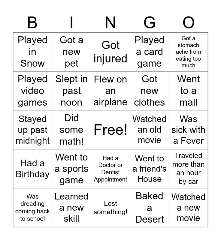 This bingo card has a free space and 29 words: Was dreading coming back to school, Were excited to come to school, Did some math!, Felt sad and gloomy because of the weather, Played in Snow, Got injured, Slept in past noon, Went to a sports game, Watched an old movie, Learned a new skill, Was sick with a Fever, Watched a new movie, Lost something!, Baked a Desert, Went to a mall, Went to the movie theater, Had a Doctor or Dentist Appointment, Had a Birthday, Got a stomach ache from eating too much, Stayed up past midnight, Went to a friend's House, Gave someone a gift, Got new clothes, Played video games, Played a card game, Got a new pet, Traveled more than an hour by car, Flew on an airplane and Went to a different country.