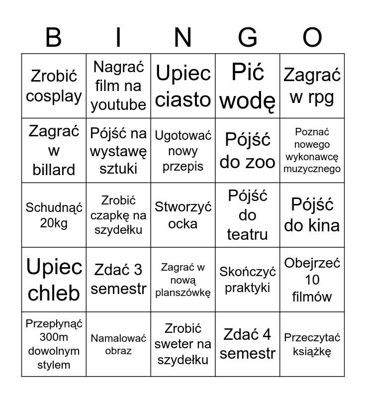 This bingo card has 25 words: Zdać 3 semestr, Zrobić sweter na szydełku, Ugotować nowy przepis, Przepłynąć 300m dowolnym stylem, Zagrać w rpg, Zrobić cosplay, Zagrać w billard, Nagrać film na youtube, Pójść do teatru, Zagrać w nową planszówkę, Pójść do zoo, Schudnąć 20kg, Skończyć praktyki, Obejrzeć 10 filmów, Pójść na wystawę sztuki, Przeczytać książkę, Pójść do kina, Upiec ciasto, Poznać nowego wykonawcę muzycznego, Zrobić czapkę na szydełku, Stworzyć ocka, Namalować obraz, Upiec chleb, Pić wodę and Zdać 4 semestr.
