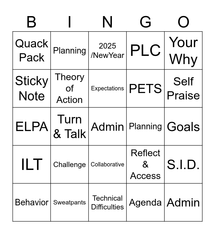 This bingo card has a free space and 24 words: Challenge, Sweatpants, Expectations, Behavior, Your Why, Quack Pack, Sticky Note, Planning, Planning, Collaborative, PETS, ELPA, Reflect & Access, S.I.D., Theory of Action, Agenda, Goals, 2025 /NewYear, Self Praise, Turn & Talk, Admin, ILT, PLC and Technical Difficulties.