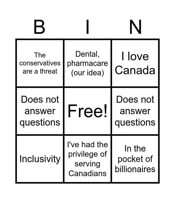 This bingo card has a free space and 10 words: I've had the privilege of serving Canadians, I love Canada, The conservatives are a threat, In the pocket of billionaires, Does not answer questions, Inclusivity, Dental, pharmacare (our idea), Environment, Does not answer questions and Inclusivity.