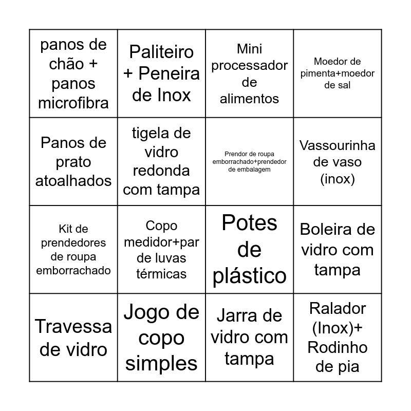 This bingo card has 47 words: Travessa de vidro com tampa (forneável), Travessa de vidro, Cesto de Roupas (bambu), Kit de 4 ou 5 descanso de panela de silicone, Fervedor anti aderente, Espremedor de batata+funil, Paliteiro + Peneira de Inox, Travessa de vidro c/tampa (forneável), tigela de vidro redonda com tampa, Conjunto de assadeira antiaderente, Prendor de roupa emborrachado+prendedor de embalagem, Moedor de pimenta+moedor de sal, Porta frios em acrílico+forma de gelo de silicone, tigela de vidro redonda com tampa, Escova de roupas + prendedor de roupa emborrachado, Conjunto de taça de sobremesa, Vassourinha de vaso (inox), Jogo de copo simples, Tábua de carne de bambu, Panos de prato atoalhados, Boleira de vidro com tampa, 2 Baldes Retratil, panos de chão + panos microfibra, Kit de prendedores de roupa emborrachado, Porta papel toalha (Inox), Copo medidor+par de luvas térmicas, Escova sanitária (Inox) +Espatula para bolo (Inox), Escorredor de macarrão (Inox), Panos de prato atoalhados, Ralador (Inox)+ Rodinho de pia, Lixeira para banheiro (5 Litros Inox), Taça de água (Vidro Incolor), Balança de cozinha+tesoura culinária, 3 potes herméticos retangulares de vidro, 3 potes herméticos retangulares de vidro, Jogo de 6 copos de vidro simples, Jarra de vidro com tampa, Kit Foundue, 3 potes herméticos retangulares de vidro, Kit Potes de plástico, Kit Potes de plástico, Mini processador de alimentos, Potes de plástico, Kit de faca, Kit Utensílio de cozinha de silicone (preto), Centrifuga de salada and Manteigueira de vidro com tampa.