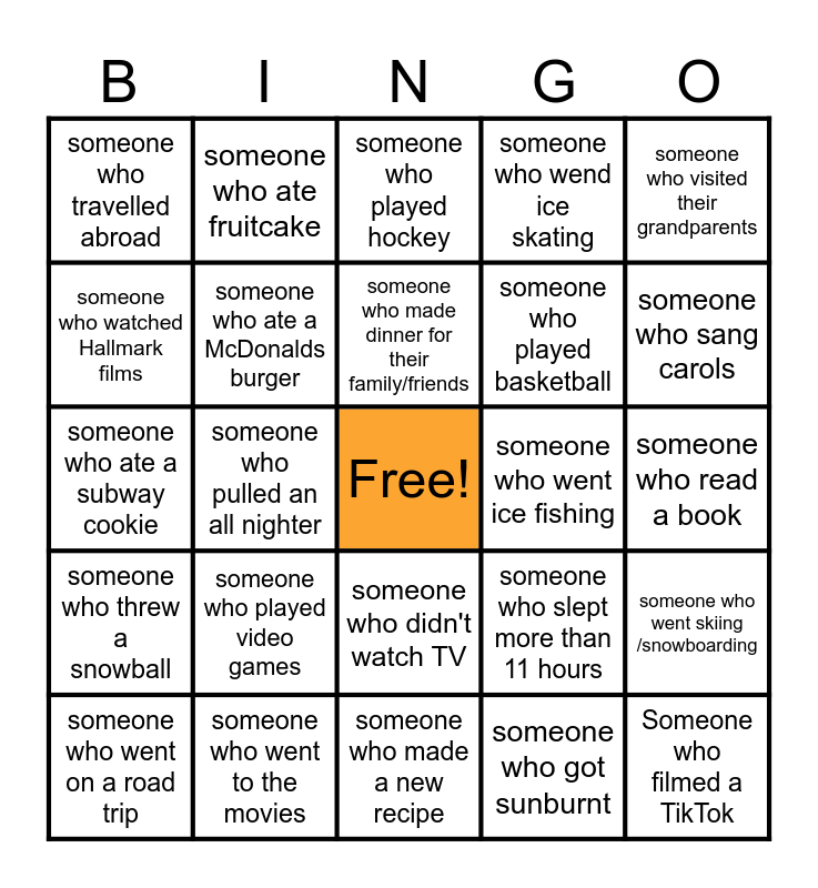 This bingo card has a free space and 24 words: someone who played video games, someone who went to the movies, someone who made dinner for their family/friends, someone who went on a road trip, someone who visited their grandparents, someone who travelled abroad, someone who watched Hallmark films, someone who ate fruitcake, someone who went ice fishing, someone who didn't watch TV, someone who played basketball, someone who ate a subway cookie, someone who slept more than 11 hours, someone who went skiing /snowboarding, someone who ate a McDonalds burger, someone who got sunburnt, someone who read a book, someone who played hockey, someone who sang carols, someone who pulled an all nighter, Someone who filmed a TikTok, someone who threw a snowball, someone who wend ice skating and someone who made a new recipe.
