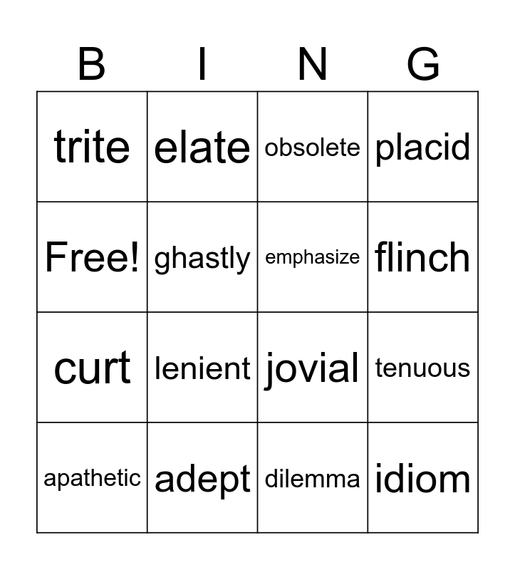This bingo card has 16 words: adept, tenuous, obsolete, trite, curt, elate, jovial, dilemma, Free!, ghastly, apathetic, placid, lenient, flinch, emphasize and idiom.