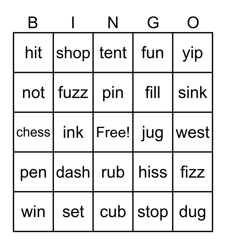This bingo card has a free space and 24 words: dash, set, pin, win, yip, hit, not, shop, jug, rub, fill, chess, hiss, fizz, fuzz, stop, west, tent, sink, ink, dug, pen, fun and cub.