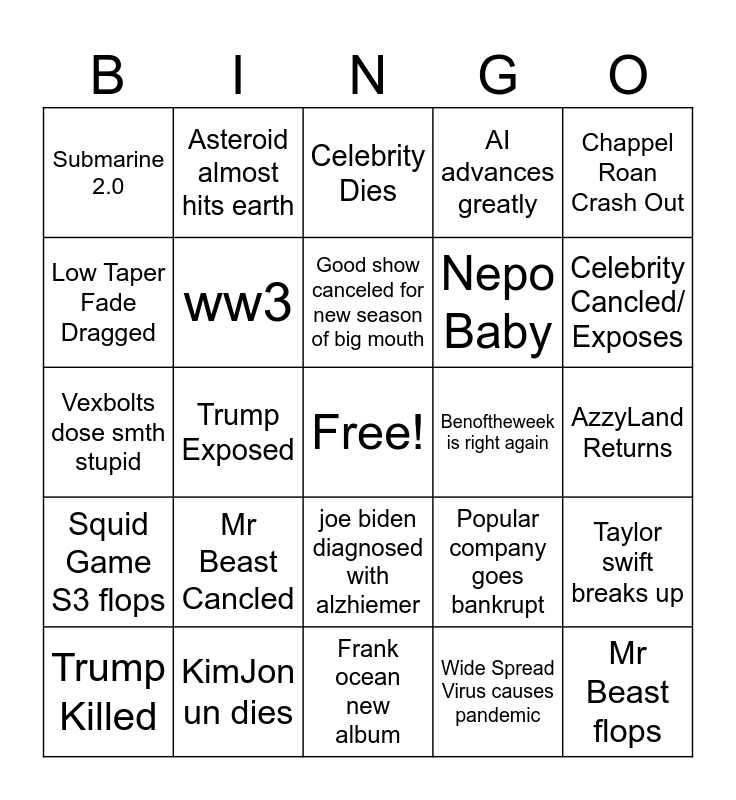 This bingo card has a free space and 24 words: Trump Killed, Mr Beast Cancled, Good show canceled for new season of big mouth, Wide Spread Virus causes pandemic, Chappel Roan Crash Out, Submarine 2.0, Asteroid almost hits earth, Celebrity Dies, Benoftheweek is right again, AzzyLand Returns, Vexbolts dose smth stupid, ww3, Popular company goes bankrupt, Taylor swift breaks up, Low Taper Fade Dragged, KimJon un dies, Frank ocean new album, AI advances greatly, Celebrity Cancled/ Exposes, Squid Game S3 flops, Trump Exposed, joe biden diagnosed with alzhiemer, Nepo Baby and Mr Beast flops.