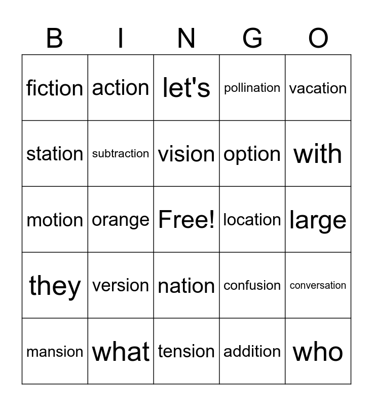 This bingo card has a free space and 25 words: version, tension, vision, mansion, vacation, fiction, station, action, location, nation, option, motion, confusion, conversation, subtraction, place, large, let's, with, orange, who, what, they, pollination and addition.