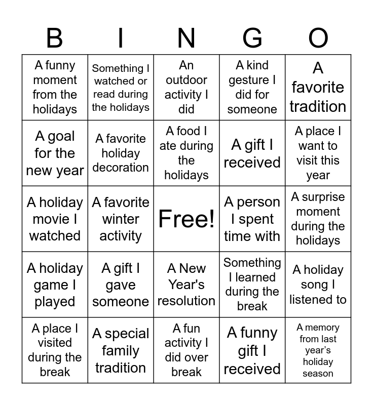 This bingo card has a free space and 25 words: A gift I gave someone, A fun activity I did over break, A food I ate during the holidays, A place I visited during the break, A favorite tradition, A funny moment from the holidays, A goal for the new year, Something I watched or read during the holidays, A person I spent time with, A New Year's resolution, A gift I received, A holiday movie I watched, Something I learned during the break, A holiday song I listened to, A favorite holiday decoration, A hobby I worked on over break, A surprise moment during the holidays, An outdoor activity I did, A place I want to visit this year, A favorite winter activity, A memory from last year’s holiday season, A special family tradition, A holiday game I played, A kind gesture I did for someone and A funny gift I received.