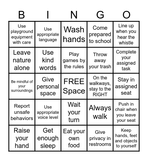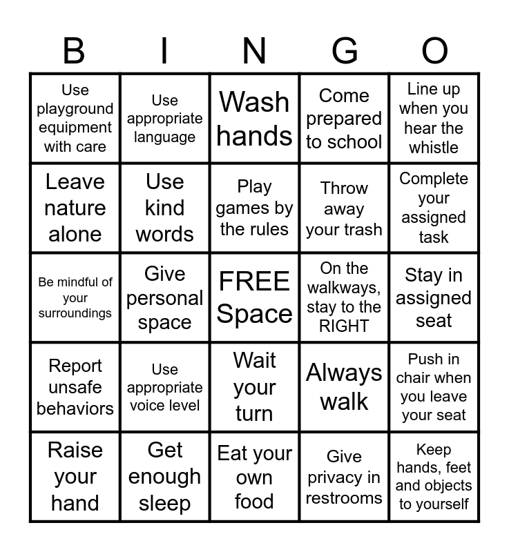 This bingo card has a free space and 25 words: Use appropriate voice level, Eat your own food, Play games by the rules, Raise your hand, Line up when you hear the whistle, Use playground equipment with care, Leave nature alone, Use appropriate language, On the walkways, stay to the RIGHT, Wait your turn, Throw away your trash, Be mindful of your surroundings, Always walk, Push in chair when you leave your seat, Use kind words, Go straight to your destination, Stay in assigned seat, Wash hands, Complete your assigned task, Give personal space, Keep hands, feet and objects to yourself, Get enough sleep, Report unsafe behaviors, Come prepared to school and Give privacy in restrooms.