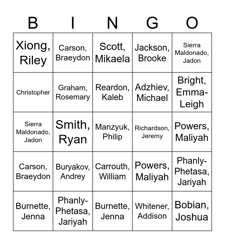 This bingo card has a free space and 46 words: Adzhiev, Michael, Bobian, Joshua, Bright, Emma-Leigh, Burnette, Jenna, Buryakov, Andrey, Carrouth, William, Carson, Braeydon, Chavez-Saenz,, Christopher, Garcia-Lugo, Ricardo, Graham, Rosemary, Jackson, Brooke, Phanly-Phetasa, Jariyah, Powers, Maliyah, Pressman, Jonathan, Rathod, Yuvraj, Reardon, Kaleb, Richardson, Jeremy, Scott, Mikaela, Sierra Maldonado, Jadon, Smith, Ryan, Whitener, Addison, Xiong, Riley, Adzhiev, Michael, Bobian, Joshua, Bright, Emma-Leigh, Burnette, Jenna, Buryakov, Andrey, Carrouth, William, Carson, Braeydon, Chavez-Saenz, Christopher, Garcia-Lugo, Ricardo, Graham, Rosemary, Jackson, Brooke, Manzyuk, Philip, Phanly-Phetasa, Jariyah, Powers, Maliyah, Pressman, Jonathan, Rathod, Yuvraj, Reardon, Kaleb, Richardson, Jeremy, Scott, Mikaela, Sierra Maldonado, Jadon, Smith, Ryan, Whitener, Addison and Xiong, Riley.