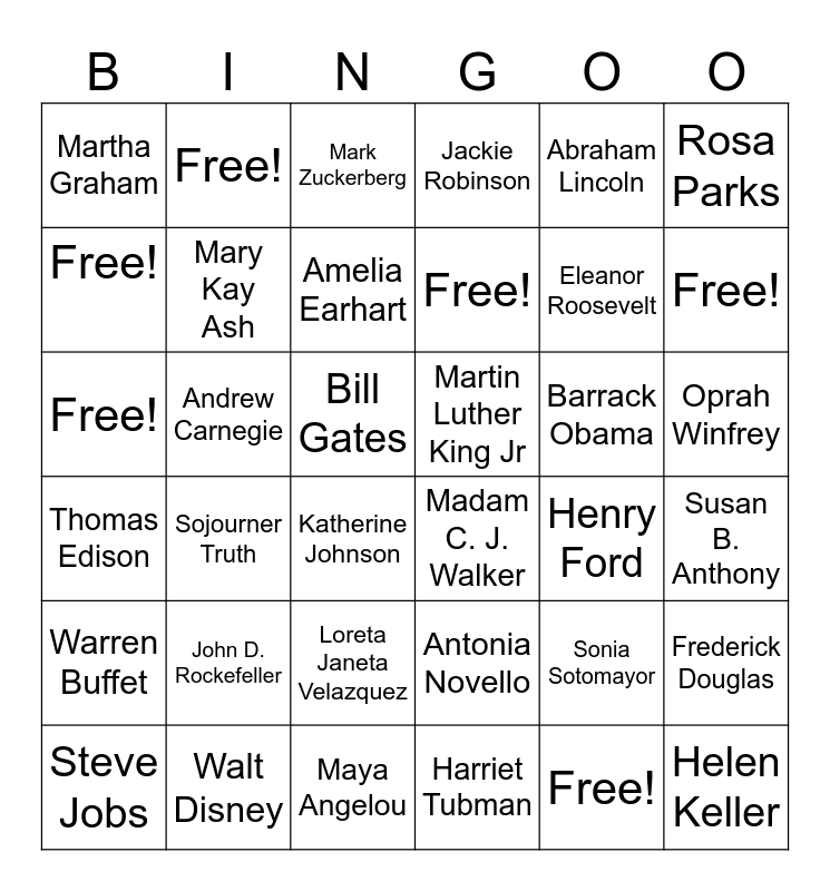 This bingo card has 36 words: Antonia Novello, Loreta Janeta Velazquez, Harriet Tubman, Free!, Thomas Edison, Martin Luther King Jr, Mary Kay Ash, Maya Angelou, Abraham Lincoln, Sonia Sotomayor, Free!, Jackie Robinson, Frederick Douglas, Andrew Carnegie, Free!, Martha Graham, Warren Buffet, Barrack Obama, Free!, Mark Zuckerberg, Bill Gates, Sojourner Truth, Madam C. J. Walker, Katherine Johnson, Henry Ford, Free!, Eleanor Roosevelt, Walt Disney, Amelia Earhart, Rosa Parks, Helen Keller, Steve Jobs, Susan B. Anthony, Oprah Winfrey, John D. Rockefeller and Free!.
