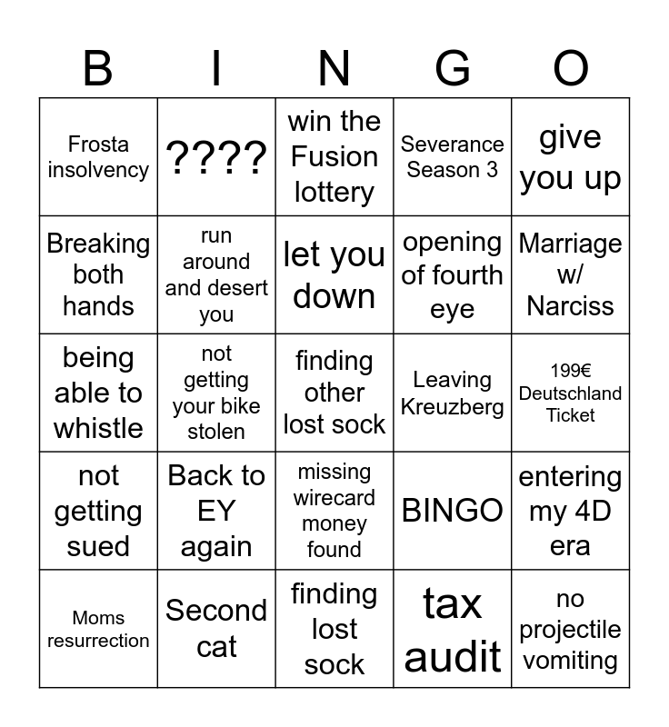 This bingo card has 25 words: Back to EY again, finding lost sock, let you down, Moms resurrection, give you up, Frosta insolvency, Breaking both hands, ????, Leaving Kreuzberg, missing wirecard money found, opening of fourth eye, being able to whistle, BINGO, entering my 4D era, run around and desert you, no projectile vomiting, 199€ Deutschland Ticket, win the Fusion lottery, Marriage w/ Narciss, not getting your bike stolen, finding other lost sock, Second cat, not getting sued, Severance Season 3 and tax audit.