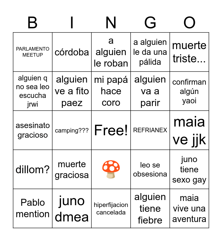 This bingo card has a free space and 24 words: muerte graciosa, juno dmea, mi papá hace coro, Pablo mention, muerte triste..., PARLAMENTO MEETUP, alguien q no sea leo escucha jrwi, córdoba, REFRIANEX, 🍄, alguien va a parir, asesinato gracioso, leo se obsesiona, juno tiene sexo gay, alguien ve a fito paez, alguien tiene fiebre, maia ve jjk, a alguien le roban, confirman algún yaoi, camping???, maia vive una aventura, dillom?, a alguien le da una pálida and hiperfijacion cancelada.