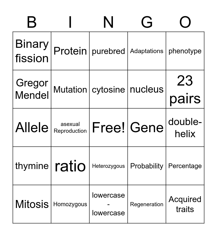 This bingo card has a free space and 43 words: Offspring, asexual Reproduction, Sexual Reproduction, Regeneration, Gametes, Mitosis, Mutation, Budding, Adaptations, traits, Binary fission, ratio, Probability, Percentage, Dominant, Recessive, DNA, Gene, chromosome, Allele, Protein, Inheritance, genotype, phenotype, Punnett Square, Homozygous, Heterozygous, Inherited traits, Acquired traits, thymine, guanine, cytosine, adenine, double-helix, Capital - lowercase, Capital - capital, lowercase - lowercase, nucleus, 23 pairs, Gregor Mendel, spores, purebred and hybrid.