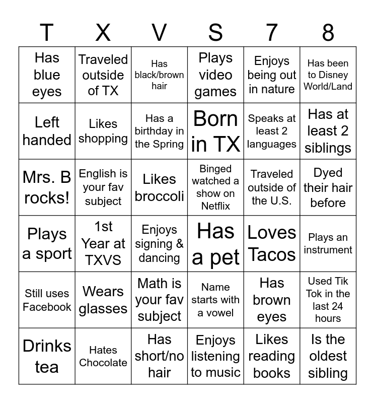 This bingo card has 36 words: Name starts with a vowel, Math is your fav subject, Enjoys listening to music, Left handed, Plays a sport, Binged watched a show on Netflix, Likes shopping, Has short/no hair, Enjoys being out in nature, Has brown eyes, Has at least 2 siblings, Plays video games, Used Tik Tok in the last 24 hours, English is your fav subject, Born in TX, Has blue eyes, Still uses Facebook, Traveled outside of the U.S., Mrs. B rocks!, Has black/brown hair, Likes broccoli, 1st Year at TXVS, Has a pet, Enjoys signing & dancing, Loves Tacos, Traveled outside of TX, Speaks at least 2 languages, Hates Chocolate, Has a birthday in the Spring, Has been to Disney World/Land, Is the oldest sibling, Drinks tea, Plays an instrument, Dyed their hair before, Wears glasses and Likes reading books.