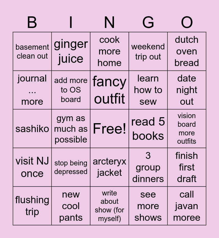 This bingo card has a free space and 24 words: stop being depressed, new cool pants, fancy outfit, flushing trip, dutch oven bread, basement clean out, journal ... more, ginger juice, read 5 books, arcteryx jacket, learn how to sew, sashiko, 3 group dinners, finish first draft, add more to OS board, see more shows, vision board more outfits, cook more home, date night out, gym as much as possible, call javan moree, visit NJ once, weekend trip out and write about show (for myself).