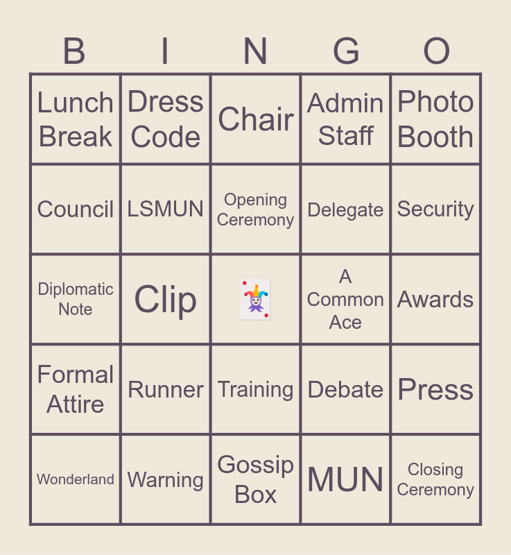 This bingo card has a free space and 24 words: Runner, Warning, Opening Ceremony, Wonderland, Photo Booth, Lunch Break, Council, Dress Code, A Common Ace, Training, Delegate, Diplomatic Note, Debate, Press, LSMUN, MUN, Awards, Chair, Security, Clip, Closing Ceremony, Formal Attire, Admin Staff and Gossip Box.