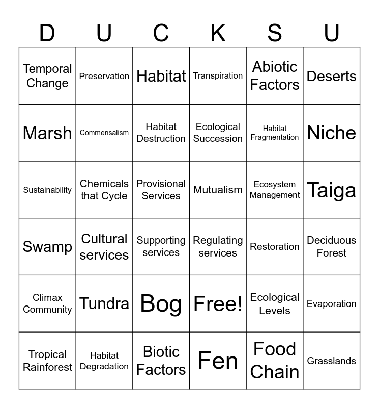 This bingo card has 36 words: Free!, Bog, Fen, Marsh, Swamp, Mutualism, Commensalism, Biotic Factors, Abiotic Factors, Ecological Levels, Niche, Transpiration, Evaporation, Chemicals that Cycle, Ecological Succession, Temporal Change, Climax Community, Ecosystem Management, Sustainability, Habitat, Provisional Services, Cultural services, Regulating services, Supporting services, Restoration, Preservation, Habitat Fragmentation, Habitat Degradation, Habitat Destruction, Deserts, Grasslands, Tropical Rainforest, Deciduous Forest, Taiga, Tundra and Food Chain.