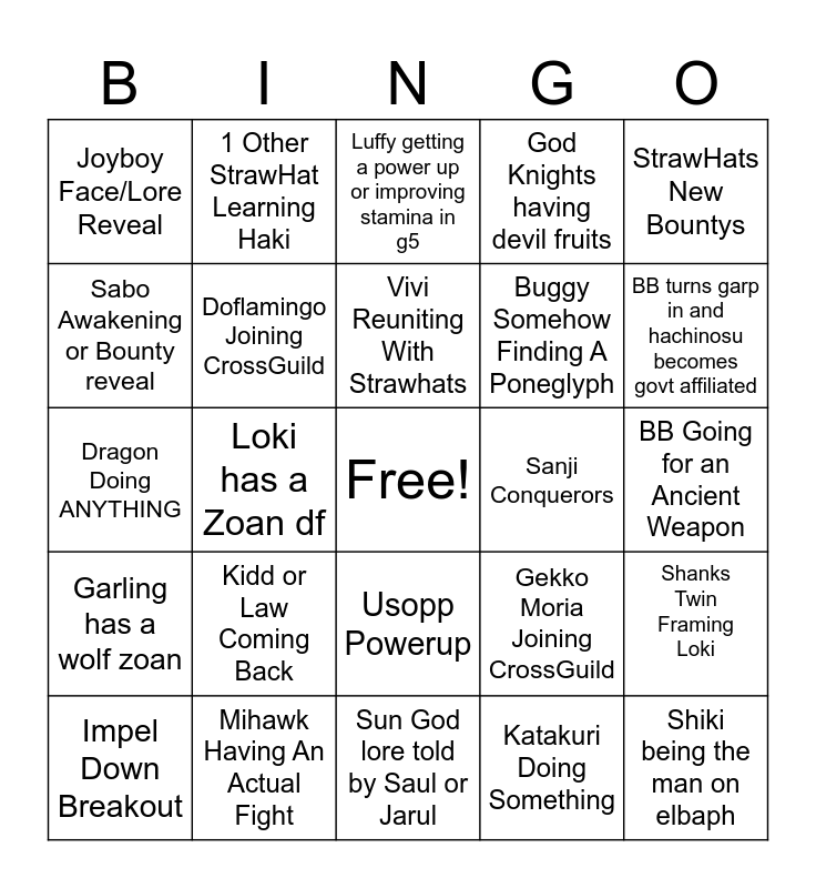 This bingo card has a free space and 24 words: Kidd or Law Coming Back, Mihawk Having An Actual Fight, Vivi Reuniting With Strawhats, Impel Down Breakout, StrawHats New Bountys, Joyboy Face/Lore Reveal, Sabo Awakening or Bounty reveal, 1 Other StrawHat Learning Haki, Sanji Conquerors, Usopp Powerup, Buggy Somehow Finding A Poneglyph, Dragon Doing ANYTHING, Gekko Moria Joining CrossGuild, Shanks Twin Framing Loki, Doflamingo Joining CrossGuild, Katakuri Doing Something, BB Going for an Ancient Weapon, Luffy getting a power up or improving stamina in g5, BB turns garp in and hachinosu becomes govt affiliated, Loki has a Zoan df, Shiki being the man on elbaph, Garling has a wolf zoan, God Knights having devil fruits and Sun God lore told by Saul or Jarul.