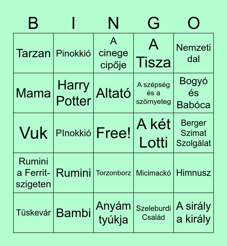 This bingo card has a free space and 24 words: Rumini, Bambi, Altató, Tüskevár, Nemzeti dal, Tarzan, Mama, Pinokkió, A két Lotti, Torzonborz, A szépség és a szörnyeteg, Vuk, Micimackó, Himnusz, Harry Potter, Szeleburdi Család, Berger Szimat Szolgálat, A cinege cipője, Bogyó és Babóca, PInokkió, A sirály a király, Rumini a Ferrit-szigeten, A Tisza and Anyám tyúkja.