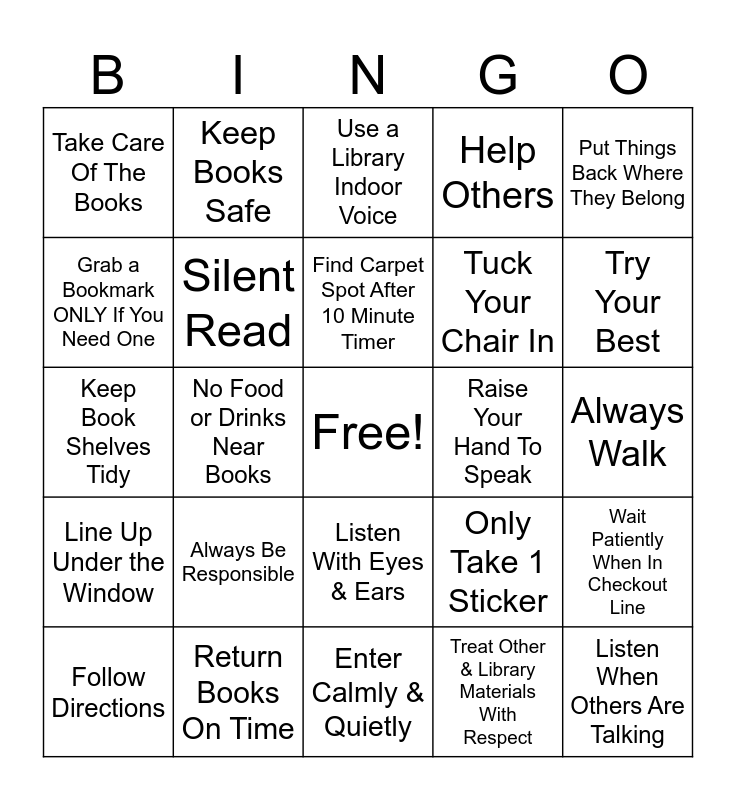 This bingo card has a free space and 29 words: Follow Directions, Keep Hands & Feet To Yourself, No Food or Drinks Near Books, Sit in Special Carpet Spot For Storytime, Take Care Of The Books, Use a Library Indoor Voice, Silent Read, Always Be Responsible, Raise Your Hand To Speak, Return Books On Time, Always Walk, Listen When Others Are Talking, Enter Calmly & Quietly, Treat Other & Library Materials With Respect, Try Your Best, Find 1 Good Fit Book, Listen With Eyes & Ears, Line Up Under the Window, Put Things Back Where They Belong, Keep Book Shelves Tidy, Only Take 1 Sticker, Read From Wire Cart If You Forgot Your Book, Tuck Your Chair In, Grab a Bookmark ONLY If You Need One, Help Others, Keep Books Safe, Wait Patiently When In Checkout Line, Find Carpet Spot After 10 Minute Timer and Enjoy The Books.