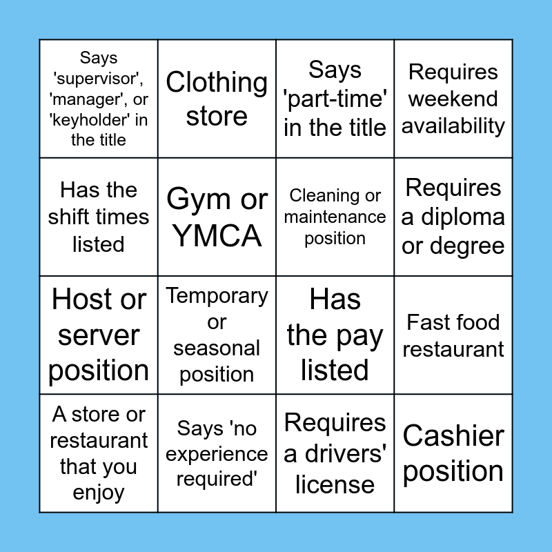 This bingo card has 16 words: Says 'no experience required', Fast food restaurant, Says 'part-time' in the title, Says 'supervisor', 'manager', or 'keyholder' in the title, Host or server position, Clothing store, Has the pay listed, Requires a drivers' license, Has the shift times listed, Gym or YMCA, A store or restaurant that you enjoy, Requires weekend availability, Temporary or seasonal position, Requires a diploma or degree, Cleaning or maintenance position and Cashier position.